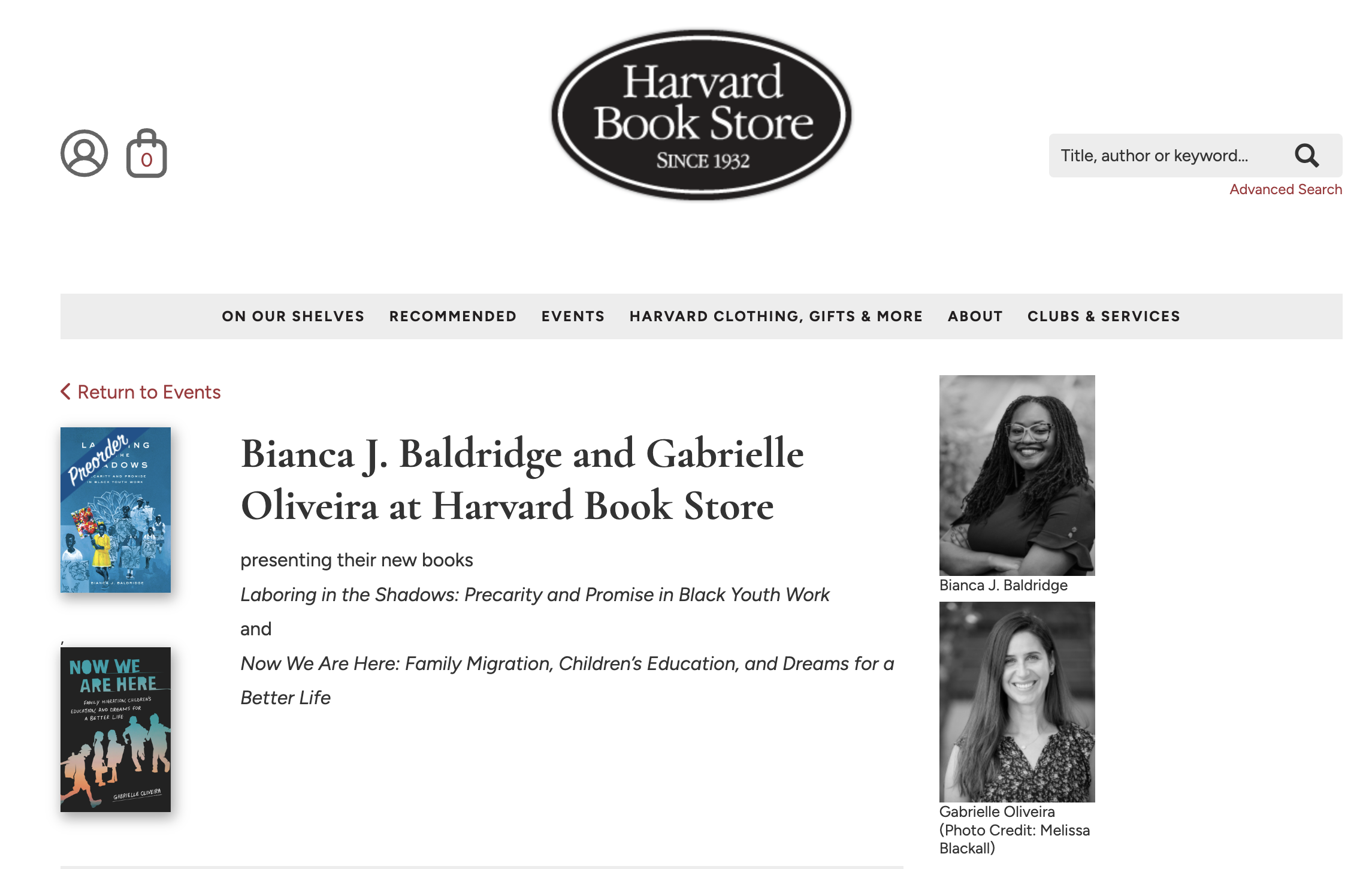Harvard Book Store welcomes Bianca J. Baldridge—Associate Professor of Education at Harvard University—and Gabrielle Oliveira—Jorge Paulo Lemann Associate Professor of Education and Brazil Studies at the Harvard Graduate School of Education—for a discussion of their new books, Laboring in the Shadows: Precarity and Promise in Black Youth Work and Now We Are Here: Family Migration, Children’s Education, and Dreams for a Better Life.
